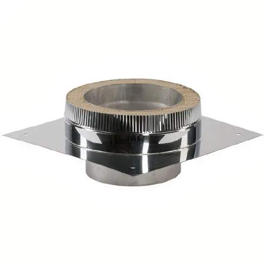 Розетта двустенная - применяется для опоры тройника (четверника) сэндвич-дымохода, обеспечивает надёжность и устойчивость всей дымоходной системы. Розетта устанавливается на консоль (пристенный кронштейн) и может выдерживать большие нагрузки. Розетта может использоваться как в качестве опорной, так и в качестве сквозной площадки. Внутренняя часть кольца площадки изготавливается из разных марок нержавеющей стали, в зависимости от используемой вставки для дымоходной системы.