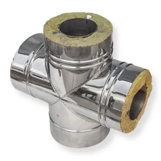 Крестовина-сэндвич 90° (утеплённый четверник) - это соединительный элемент дымоходной системы. Используется для изменения направления дымохода и разделения дымовых газов по трубам. Сэндвич-четверник 90 градусов можно использовать для объединения в одну общую систему два отдельных дымовых канала. Основная причина установки четверника вместо тройника, это невозможность монтажа ревизии под тройником в связи с ограничением пространства. Согласно конструктивным особенностям четверник является утеплённым. Изготавливается из разных марок жаропрочной нержавеющей стали.