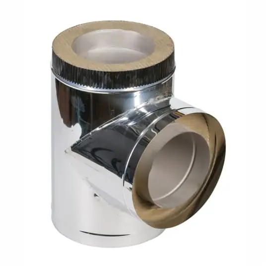 Тройник-сэндвич 90° (утеплённый тройник) - это основной элемент дымоходной системы. Используется для отвода исходящих газов в прямой участок дымохода. Сэндвич-тройник 90 градусов можно использовать для заднего подключения котла или печи-камина. Наличие тройника предотвращает попадание конденсата в отопительную систему. В нижней части сэндвич-тройника необходимо устанавливать ревизию, заглушку, или сборник конденсата. Согласно конструктивным особенностям тройник является утеплённым. Изготавливается из разных марок жаропрочной нержавеющей стали.