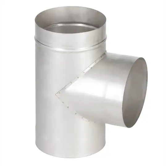 Тройник 90° - это основной элемент дымоходной системы. Используется для отвода исходящих газов в прямой участок дымохода. Тройник 90 градусов можно использовать для заднего подключения котла или печи-камина. Наличие тройника предотвращает попадание конденсата в отопительную систему. В нижней части тройника нужно устанавливать ревизию, заглушку, или сборник конденсата. Согласно конструктивным особенностям тройник является неутеплённым. Изготавливается из разных марок жаропрочной нержавеющей стали.