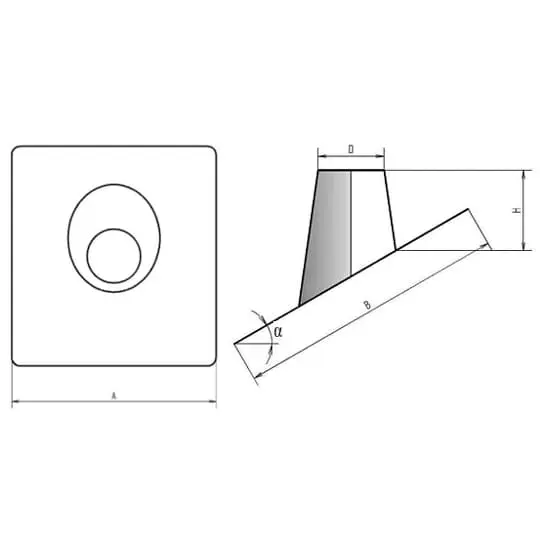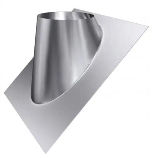 Уплотнение кровли (крышная разделка угловая) - кровельный проходной элемент, представляет собой стальную конструкцию из пластины и конуса. Используется при прохождении дымоходной трубы через кровлю. Крышная разделка дополняется косынкой (юбкой), комплектуется отдельно. Изготавливается из жаропрочной нержавеющей стали.